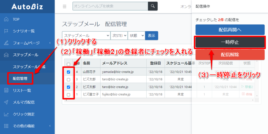 手順1で待機状態(一時停止)にした人に、ステップメールの配信再開を行います。